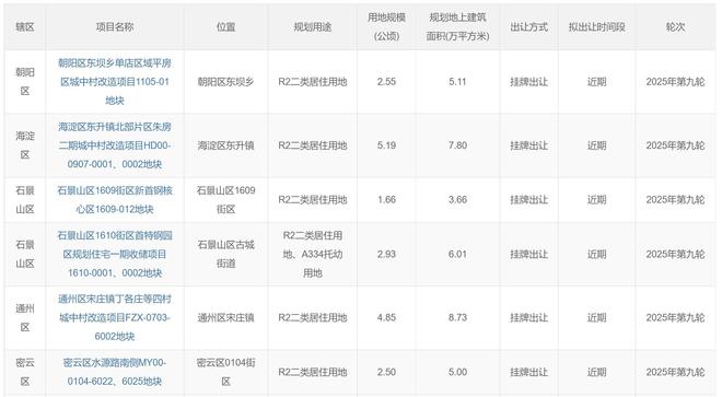 11月21日晚,北京市规委官网发布了2025年第九轮商品房出让名单,共涉及6块地块,用地面积近20公顷,建筑规模近36万平方米。上述土地计划于近期交付。从地区分布看,中心城区4例(朝阳区1例、海淀区1例、石景山区2例),通州区、密云区各1例。数据来自北京市规划委员会官方网站。在这六块地块中,最引人注目的无疑是海淀朱坊地块。朱坊二期城中村改造项目HD00-0907-0001、0002地块位于海淀区东升镇。该地块性质为纯住宅用地,用地占地面积5.19公顷,规划上部建筑面积7.8万平方米。该地块紧邻北五环路,西邻京藏高速公路。最近的地铁站是8号线永泰庄站,距离约1.5公里。地块以西约3公里处,有今年海淀的两个热点项目:震云和建发海燕。两个项目网上签约均价在13万/㎡左右。所属清河地段二手价在6.7万/㎡左右。珠坊地块周边生活配套丰富。距清河万象汇、西三旗万喜汇等大型商业设施约3公里。附近还有奥林匹克森林公园北公园、东小口城市公园等休闲设施。虽然不如西二旗的产业优势,但1公里的中关村东升科技园也聚集了数百家高科技企业远离这片土地的北部。而据近期消息报道,字节跳动已租用东升科技园二期1号楼,抖音内容运营、研究管理、判断等约2000名字节跳动员工预计将于明年3月搬迁至此。也可为珠坊项目未来的销售提供购买力支持。另一个亮点是朝阳区东坝1105-01地块。该地块为R2二级住宅用地,用地面积2.55公顷,规划上部建筑面积5.11万平方米。东坝地块位置毗邻地铁3号线东坝站、东坝南站、姚家园站,居住环境浓厚,万达广场、金隅购物中心、北京第一中西医结合医院(东八院区)、北京体育休闲公园等配套设施星罗棋布。东坝二手房价格45,000/㎡。地块周边二手房有金隅荟景园4.7万/㎡左右、首开艾维6.6万/㎡左右、口碑稍好一点的保利首开9.4万/㎡左右。石景山区涉及的房屋有两处,均位于古城的街道上。一是1609地块,毗邻地铁11号线新首钢站,周边有柳工汇购物广场、济南环宇汇购物中心、首钢公园、北京冬奥公园等生活配套设施。 1609地块位置。一是1610地块,毗邻地铁1号线、6号线、S1号线换乘站、苹果园站、11号线北新安站。周边有西龙多购物中心、京西大悦城、古城公园、首钢公园等生活配套设施。该地块位置位于1610地块。此外,通州区新住宅位于位于六环外宋庄镇。北边是宋庄画家村。生活设施不错。西北并不远。这里有宋庄艺术小镇和安贞医院,还有宋庄北侧第一长街。通州宋庄地块位于密云新地块内,位于密云区0104地块。周边有北京密云万象汇、燕内奥特莱斯购物中心、国泰百货(密云店)、北京大学第一医院密云院区、奥林公园等配套设施。密云地块位置
